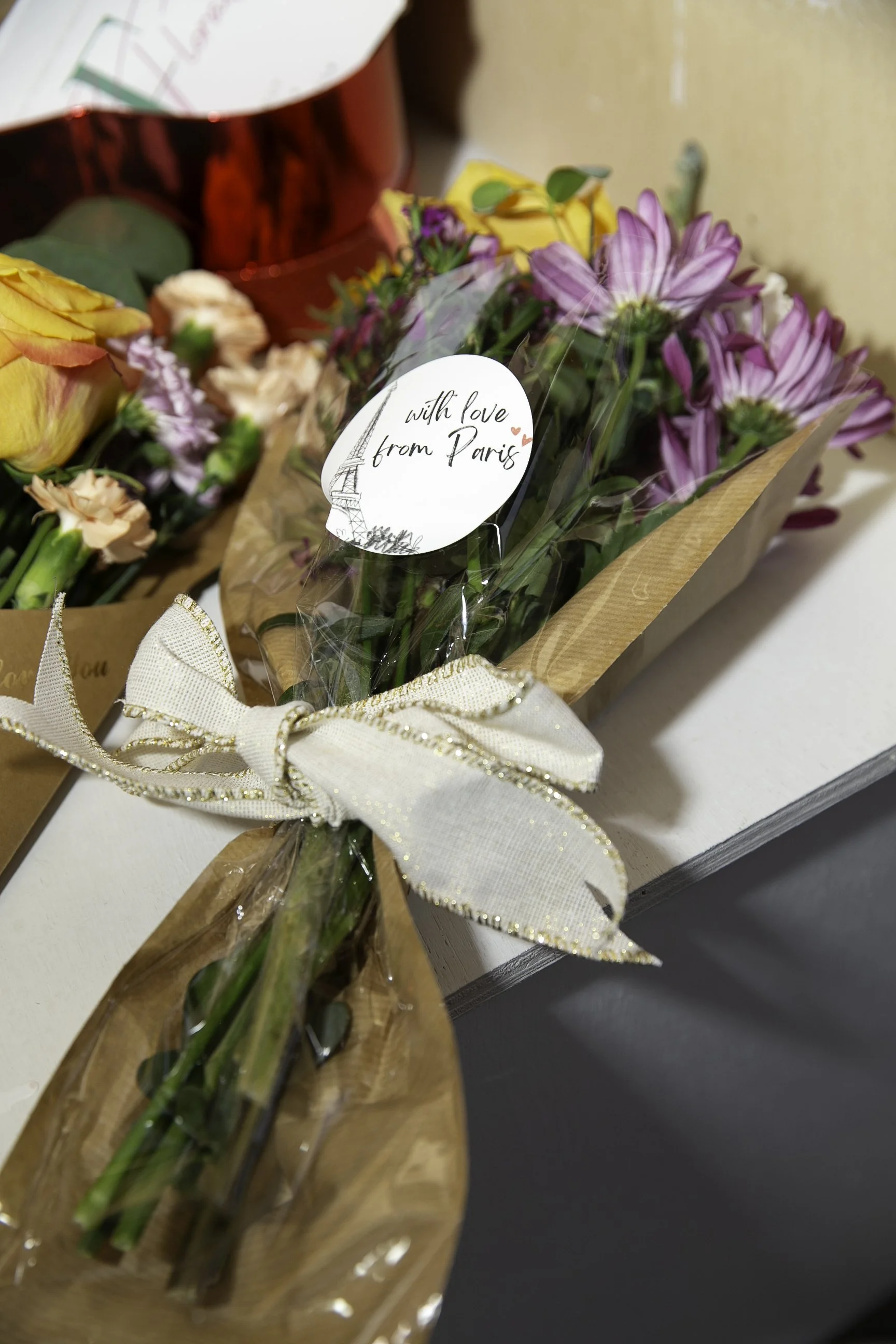 From the moment guests received their invitations with the words "With love, from Paris," the stage was set for an evening in the City of Love. As guests arrived to the party, they were welcomed by a charming flower cart on the front porch, just like the cute flower stands found in Parisian markets ("Emily in Paris" fans - you know exactly what I'm talking about!) This not only added to the ambiance but also served as an awesome party favor, where guests were able to create their own bouquets to take home at the end of the night.